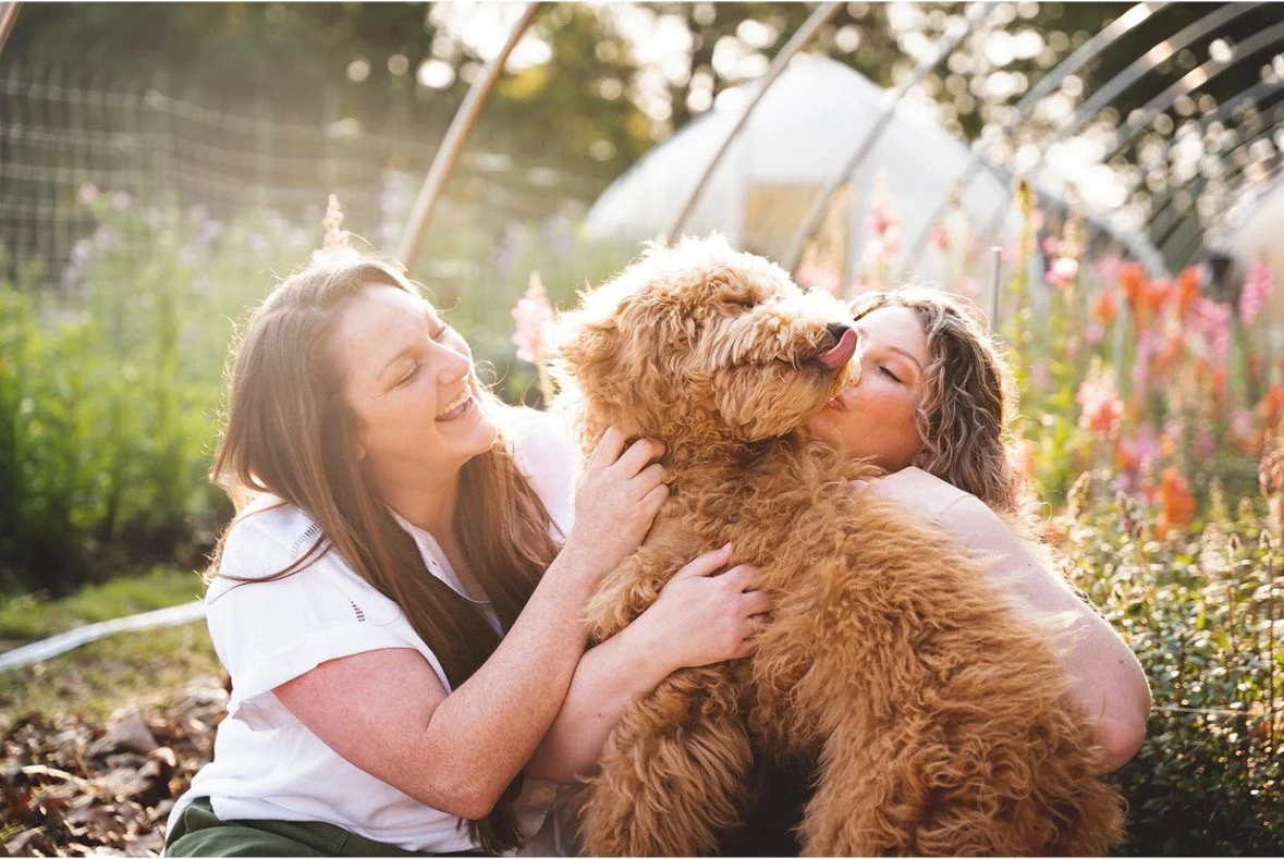 Two women smiling and playing with a fluffy dog in a garden with flowers and sunlight.