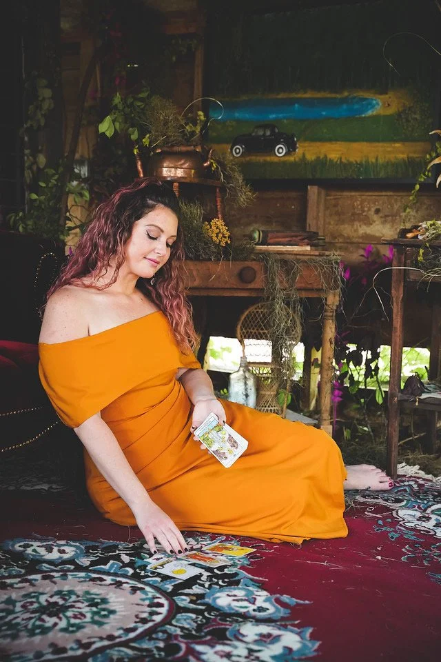 Woman in orange dress sitting on a rug, holding tarot cards, surrounded by plants and rustic decor, with a painting of a car near a lake in the background.
